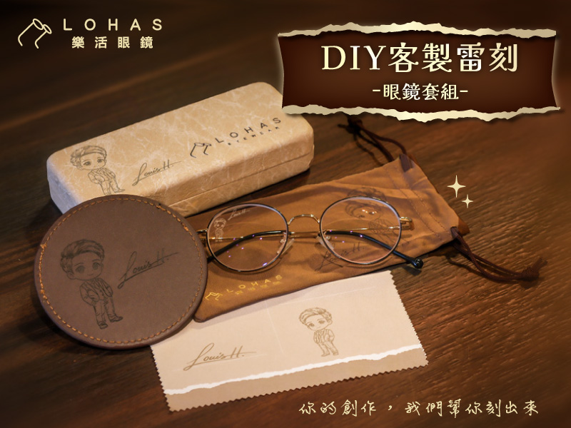 DIY 客製雷刻眼鏡套組 不只刻在鏡片上。 你的手寫、塗鴉、圖案, 可以刻在鏡片、眼鏡布、眼鏡盒 上, 成為一整套只屬於你的專屬設計。