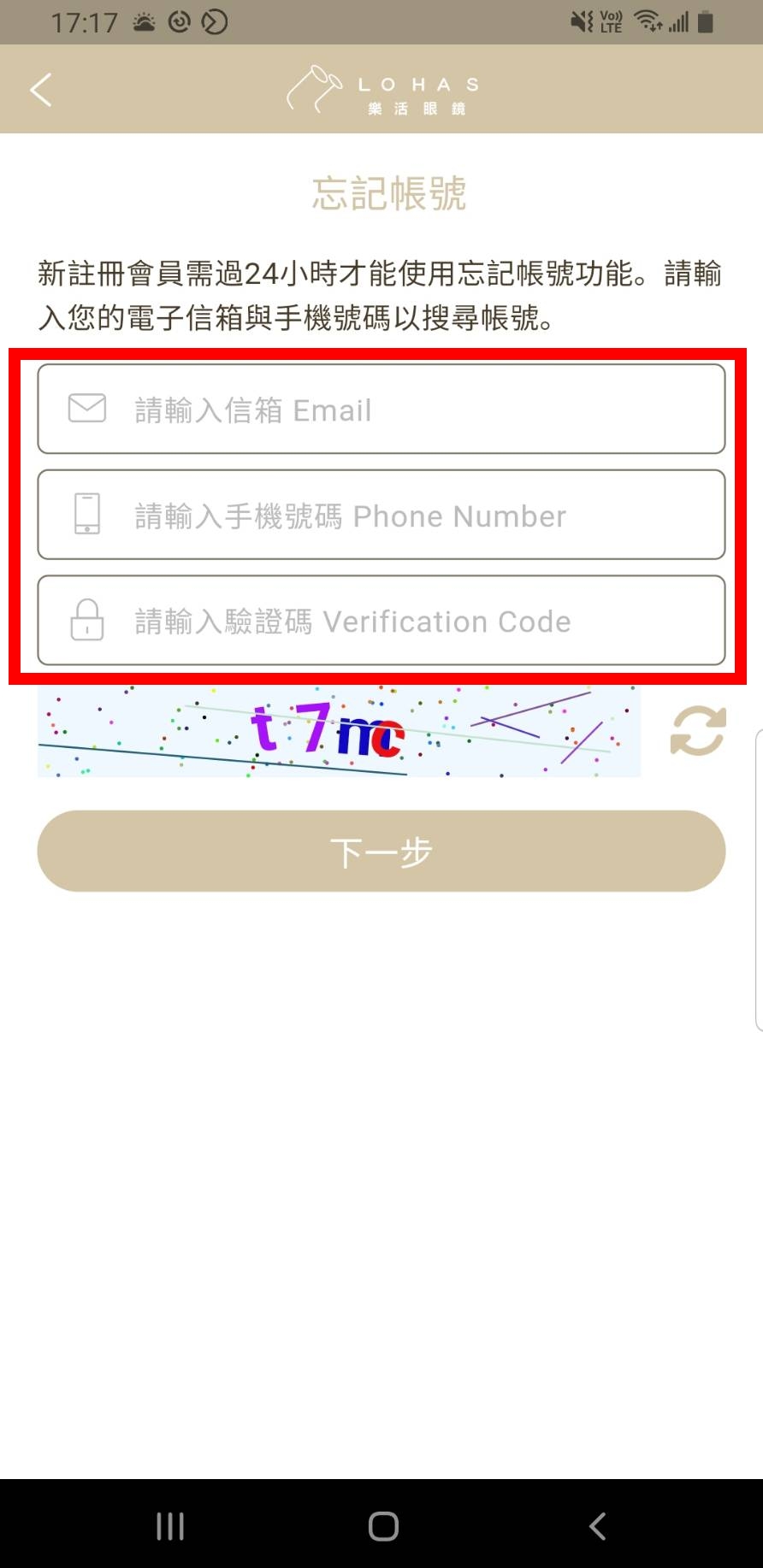 2. 輸入註冊時使用的 電子信箱、手機號碼,並填寫下方 驗證碼,再點選 「下一步」