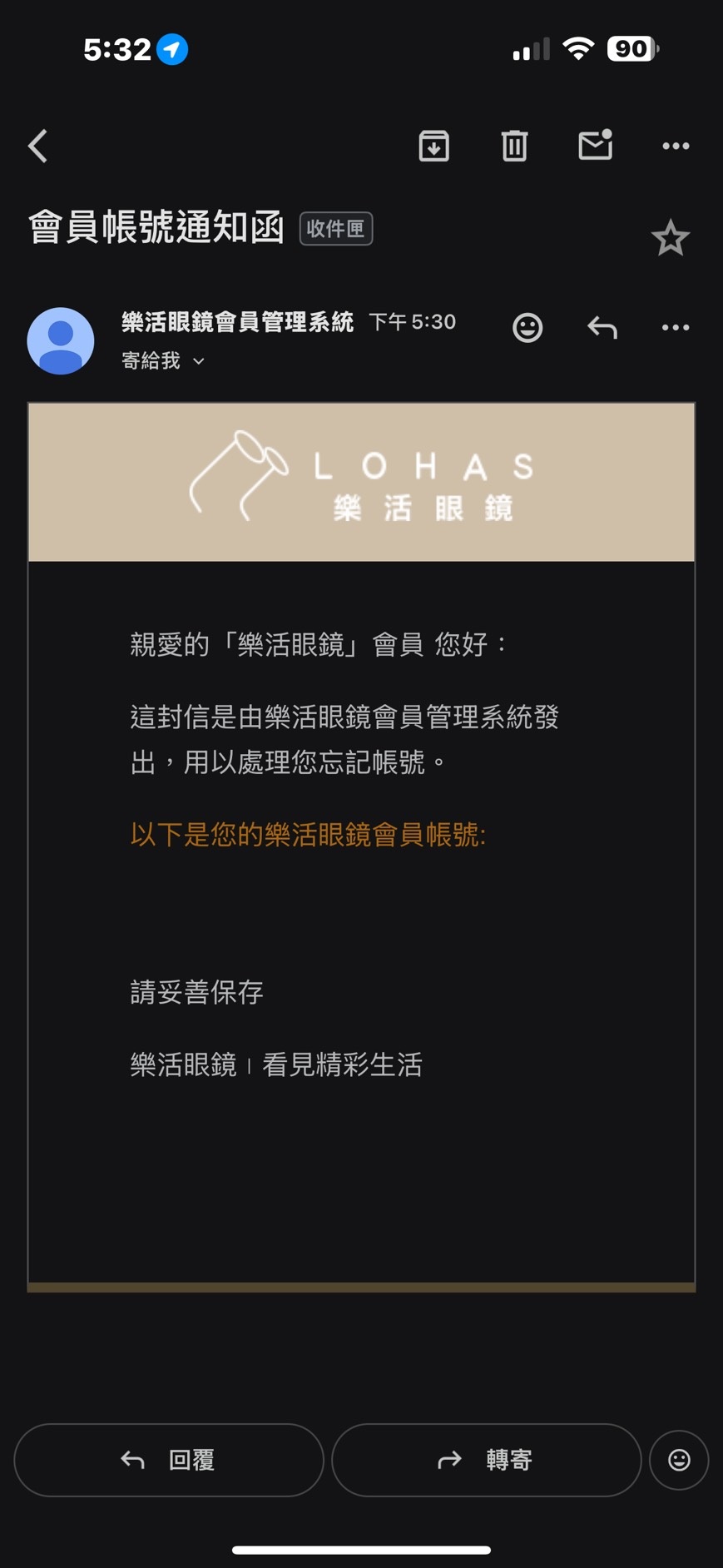 3. 系統將寄出一封包含 會員帳號資訊 的通知信件
